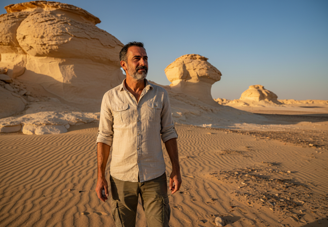 An Italian artisan discovers the White Desert's chalk formations, camping under the stars with friends in Egypt's surreal landscapes.