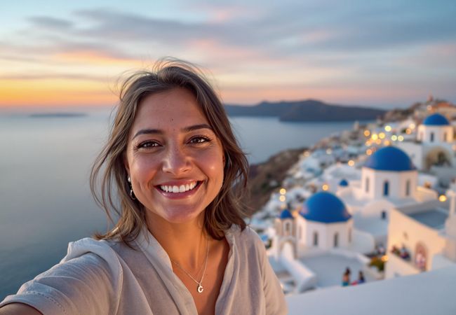 Exploring the iconic village of Oia, Santorini with friends, capturing breathtaking sunsets, and savoring authentic Greek flavors.