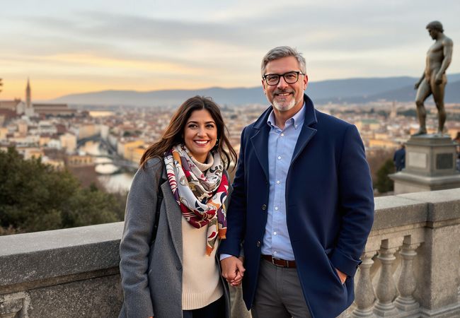 Explore Florence's rich art and culture with Mei and David on a romantic 7-day escape, staying at the cozy Hotel California.