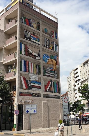 Discover the stunning mural at BIBLIOTEKA - Franko Dine in Tirana, Albania, a captivating tourist attraction that blends art and culture.