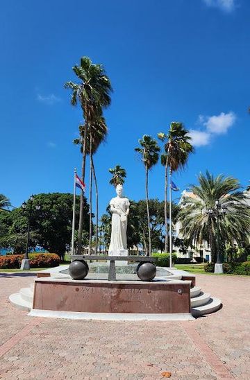 A serene waterfront park in Oranjestad, Aruba, honoring Queen Wilhelmina and offering a peaceful escape with beautiful statues and ocean views.