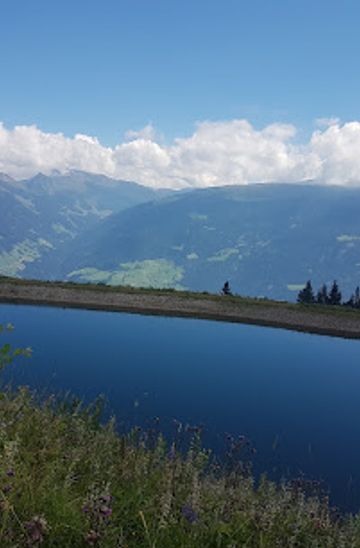 From Kaltenbach or Ried im Zillertal, follow the Zillertaler Höhenstraße, a panoramic toll road, directly to Speichersee Mizun. The toll is approximately €9 for a car. The road is well-maintained but can be narrow in places, so drive carefully. Parking is available at the lake.