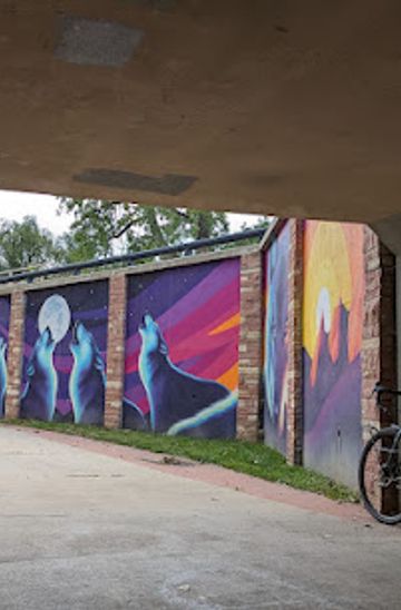 From the Boulder bike path near Pearl Street Mall, head east on Pearl Street towards 28th Street. Turn left onto 28th Street and continue north until you reach Lookout Road. Turn right onto Lookout Road and follow it until you reach the intersection with Gunpark Drive. The mural is located at this intersection. The walk is approximately 6 miles and will take over 2 hours.