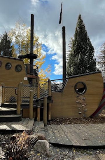 Take the free Town of Vail bus to the Ford Park stop. From the bus stop, walk a short distance north towards the park. The Pirate Ship Playground will be visible on your left. The Town of Vail offers free year-round bus service throughout Vail.
