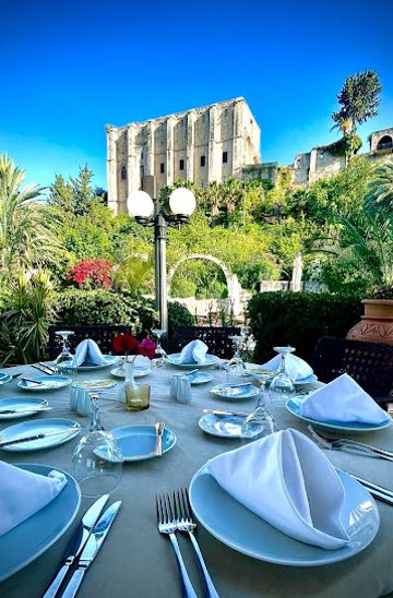 Experience exquisite Mediterranean cuisine amidst breathtaking views at Bellapais Gardens Hotel in Beylerbeyi.