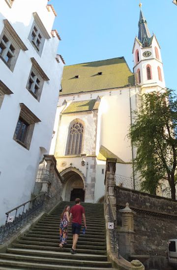 If you are near the Church of St. Vitus, exit the church and head down the narrow street leading to the main square. Once you reach the square, turn right onto Latrán and follow it to the river. Cross the bridge and continue straight. You will eventually reach Horní Street; turn right and continue for about 5 minutes until you find Kříž u schodiště at Horní 158.