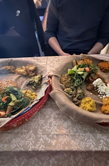 Carnivores are well served with rich, deeply spiced options. Zigni, a tender beef stew cooked with berbere chili, garlic, ginger and clarified butter, is a house staple. Tibsi, stir-fried beef or lamb with onions, tomatoes and green chili, offers a slightly drier, more aromatic alternative. For more adventurous palates, kitfo – finely chopped beef served raw or lightly cooked in spiced butter – is a standout, typically paired with cottage cheese, mustard and a fiery awaze chili paste.There are combination platters that bring together red and white tibsi, chicken in berbere sauce, zigni and a boiled egg, all arranged over injera so everyone at the table can tear, dip and sample a bit of everything. These combos are particularly good value and make an easy introduction if you are new to the cuisine. Offal lovers can seek out dlot, a robust dish of lamb or beef entrails cooked with onions, rosemary and green chili.Vegetarian comfort and gentle spices