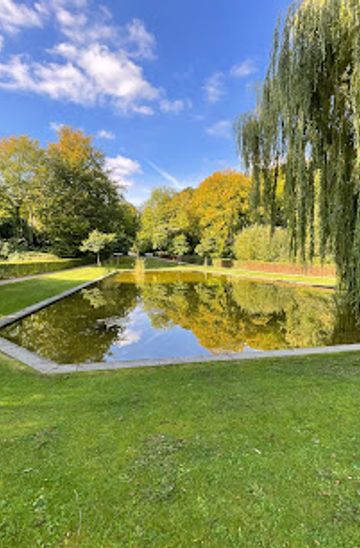 Tell me more about AarhusA quiet flower garden in Aarhus’ Mindeparken, where a long mirror pool and the bronze Solhesten sculpture create a tranquil, reflective retreat near Marselisborg Palace.