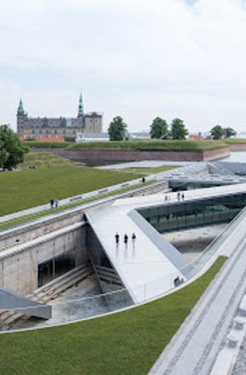 The museum’s most startling exhibit is its building. Designed by Bjarke Ingels Group and opened in 2013, it occupies the walls of a 150‑meter‑long former dry dock, leaving the dock itself as an open void. The structure never rises above ground level, preserving unbroken views towards Kronborg, yet once you step onto the sloping bridges you descend into a dramatic urban canyon of raw concrete and angled glass. Galleries loop around the dock in a gentle, continuous slope, echoing the feeling of moving through a ship. Bridges criss‑cross the chasm, doubling as circulation routes, an auditorium and outdoor promenades. At night, the geometry of steel, glass and concrete is reflected in pools of light, turning the dock into a theatrical stage.Immersive Exhibitions and Maritime Lives