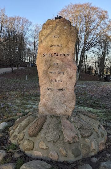 The memorial stone commemorating the 1839 gathering was unveiled on 11 October 1882, marking Blicher's centenary. Carved from natural stone and crowned with Blicher's symbol—the heath lark—the monument bears the inscription: "1839 stævnede St. St. Blicher her første Gang til dansk Folkemøde" (In 1839, St. St. Blicher convened here for the first time to a Danish people's assembly). The stone stands among numerous other memorials that have accumulated on Himmelbjerget over nearly 150 years, each recording pivotal moments in Danish history and culture.Nearby stands the Tscherning Stone, honoring Anton Frederik Tscherning, an officer and advocate for peasant equality who championed universal military service alongside Blicher. The Kvindeegen (Women's Oak), planted in 1915 following the extension of voting rights to women, commemorates the constitutional amendment of that year. Hans Christian Andersen's Bench, established after the author's 1850 visit, overlooks the Gudenå valley with views extending toward Silkeborg. These layered memorials transform Himmelbjerget into an open-air chronicle of Danish democratic development.Landscape and Access