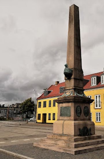 Tucked beside the quays at Havnen 23, the Mindesmærke for slagene i Køge Bugt stands where the town meets the open waters that once decided Denmark’s fate at sea. The setting is unapologetically maritime: fishing boats and leisure yachts bob close by, gulls wheel overhead and the wind carries the mix of salt air and engine oil that defines a working harbour. Against this backdrop, the monument rises from a small paved plinth, a deliberate pause in an otherwise practical landscape.From a distance, you first notice its verticality – an obelisk-like form in pale stone, geometric yet softened by weather, framed by masts and cranes. As you draw nearer, details sharpen into view: carved reliefs, inscriptions and naval motifs that turn a simple column into a compact history lesson. The monument feels both modest in scale and monumental in meaning, a local landmark that anchors the whole waterfront in its past.Naval battles that shaped a kingdom