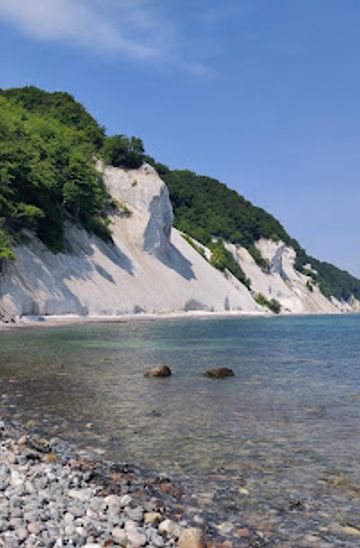 At the bottom of the stairs, the setting changes from shaded woodland to an open shore of pebbles, chalk rubble, and driftwood. Here you can look straight up at walls of rock that rise well over a hundred metres, streaked with flint bands and pitted where the sea and weather have carved hollows. The constant slow erosion of the cliff face means the shoreline is never quite the same from year to year, and occasional rockfalls leave fresh white scars and new boulders at your feet. The Baltic Sea here often appears milky turquoise, coloured by tiny chalk particles washed from the cliffs. On calm days the water laps gently against the stones, while seabirds trace the line of the coast above. Fossil enthusiasts scan the chalk blocks for imprints of ancient sea creatures, reminders that this dramatic landscape began as a quiet ocean floor.Forest Ridges and Cliff-Top Trails