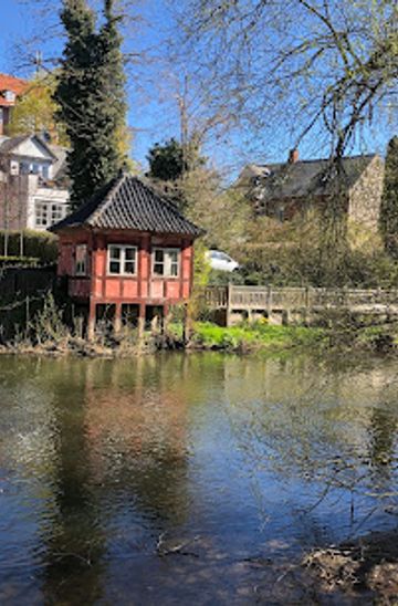 For visitors, the pavilion is less about going inside and more about appreciating its setting. It acts as a focal point along the footpath that follows Odense Å between Hunderupvej, Munke Mose and the city center. Walkers and cyclists drift past, often slowing as the bright red house appears ahead between the trees, perched over the greenish water. Benches and grassy banks nearby encourage you to linger, watch ducks slide past the stilts and feel the city recede slightly, even though shops and streets lie just beyond the park edge. The scale is human and intimate: a single small room above the river, suggesting quiet afternoons and a time when leisure and landscape design were closely linked.Literary echoes and postcard-perfect views