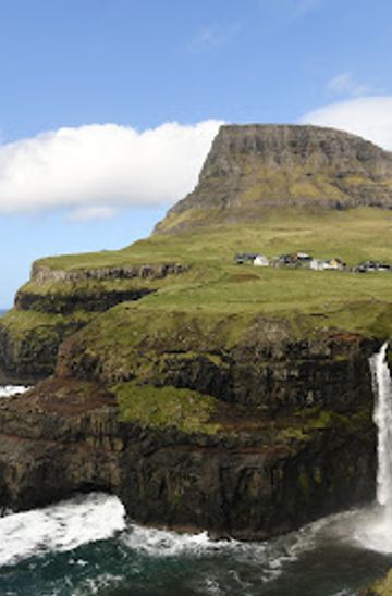 Start at the center of Vágur, near the church (Vágur Church). From here, head northeast towards the coastal road (Road 40). Follow this road as it winds along the coastline, enjoying the scenic views. After approximately 1.5 kilometers, you will reach the village of Gasadalur. As you enter Gasadalur, look for a sign indicating the direction to Múlafossur Waterfall. Continue walking straight. The path will lead you toward the edge of the village, where you will find a well-marked hiking trail. Follow this trail for about 20-30 minutes; it will take you directly to Múlafossur Waterfall, which is located at the end of the trail overlooking the stunning cliffs and the ocean.