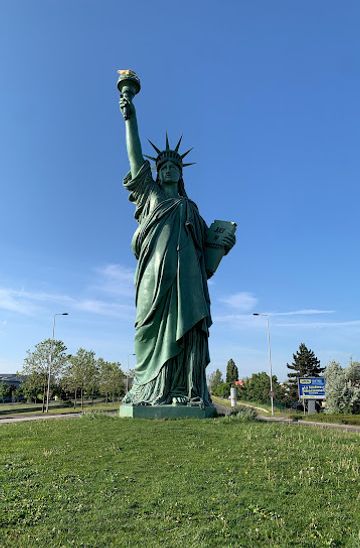 A scaled replica of the Statue of Liberty stands in Colmar, France, the birthplace of sculptor Frédéric Auguste Bartholdi. Erected in 2004 to mark the centennial of his death, the statue commemorates Bartholdi's legacy and the enduring Franco-American friendship.
