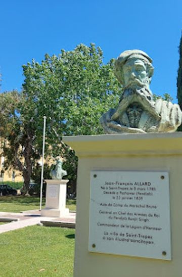 A bronze bust of Maharajah Ranjit Singh stands in Allard Square, Saint-Tropez, commemorating the historical connection between the Sikh Empire and France. The statue honors General Jean-François Allard, a native of Saint-Tropez who modernized Maharajah Ranjit Singh's army in the 19th century, fostering a lasting bond between Punjab and the French Riviera.
