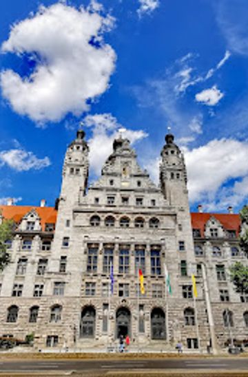 From the Markt (market square) in Leipzig's city center, walk south along Petersstraße, then turn right onto Burgstraße. Continue straight, crossing the Martin-Luther-Ring. The New Town Hall will be directly ahead on the left. The walk is approximately 5-10 minutes and offers views of other city center landmarks.