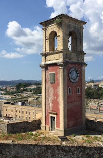 A historic clock tower in Corfu's Old Fortress, offering panoramic views and a glimpse into the island's Venetian, French, and British past.