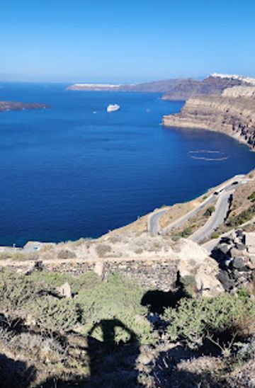 From Pyrgos, head to the nearest bus stop and take the bus towards Megalochori. The bus ride will take about 10-15 minutes. Once you arrive at the Megalochori stop, exit the bus and walk towards the caldera area. Follow the path leading up to the viewpoint, which is well-marked with signs. The walk should take approximately 15 minutes from the bus stop.
