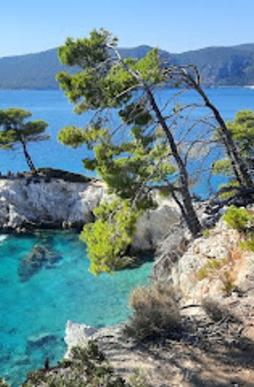 Amarandos Cove, located near Agnontas on Skopelos Island, is a scenic spot famed for its turquoise waters, rocky coves, and three iconic pine trees featured in the movie *Mamma Mia!*. This tranquil location offers swimming, snorkeling, and stunning photo opportunities.