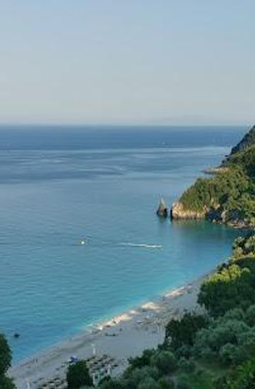 Agii Saranta Beach, near Zagora in Pelion, Greece, is a stunning coastal escape. Known for its golden sands, clear turquoise waters, and the iconic 'Monk' rock formation, it's perfect for relaxation, swimming, and exploring local culture.