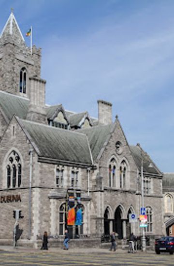 From the main entrance of Trinity College, head southeast towards Dame Street. Continue walking straight until you reach the intersection with George's Street. Cross over to the opposite side using the pedestrian crosswalk. Continue on Dame Street until you reach the traffic lights at Christ Church Place. Turn left onto Christ Church Place, and you will soon see the entrance to Dublinia on your right at St. Michael's Hill.