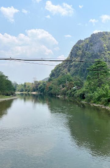From Vang Vieng town center, head south towards the Vang Vieng Resort. Enter the resort and cross the bridge over the Nam Song River. Continue along the path for about 200 meters to the base of the cave. From there, ascend approximately 150-200 steps to reach the cave entrance. Note that there is a 5,000 LAK fee to enter the Vang Vieng Resort area and cross the bridge. The entrance fee to the cave itself is 15,000 LAK.