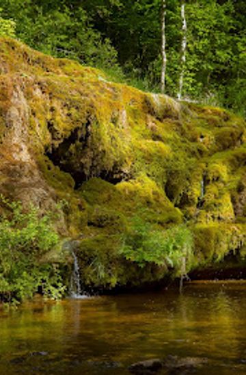 Raunas Staburags is a unique freshwater limestone formation in Latvia, the only one of its kind since 1966. Formed over thousands of years, it's a natural wonder covered in moss and flowing with spring water, creating a picturesque scene year-round.