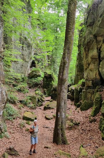 From the edge of Consdorf village, follow the network of wooded trails into the Mullerthal, where Sight Seeing Rock appears as a prominent boulder amidst tall sandsone cliffs and dense forest canopies.