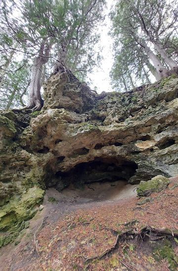 Start your journey at the Mackinac Island Ferry Dock. From the Ferry Dock, head east along Main Street. Continue straight until you reach the intersection with Cadotte Avenue. Turn right onto Cadotte Avenue. After walking for about 0.3 miles, you will reach Fort Mackinac. Continue past the fort, and soon you will see the entrance to the Historic State Park trail. Follow the signs for the trails leading to the East Bluff. The trail will guide you through beautiful scenery. Keep an eye out for signs directing you to Eagle Point. After a short hike of approximately 1 mile, you will reach Eagle Point Cave, located along the bluff with stunning views of the surrounding area.