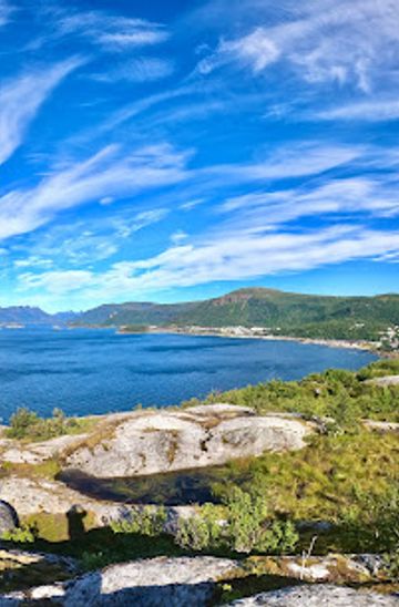 Start at the Bodø city center (Torget) near the Bodø Bus Station. Head east on Storgata towards the harbor. Continue straight until you reach the end of the harbor, where you will find the ferry terminal. From the ferry terminal, take the ferry to Festvåg. The ferry ride takes approximately 30 minutes. Once you arrive at Festvåg, disembark and follow the signs to the hiking path leading to Rampen Via Ferrata. The trailhead is about a 20-minute walk from the ferry terminal. Follow the marked path until you reach the Via Ferrata.