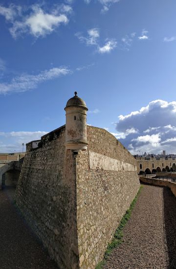 If you are starting from the Plaza de España, head southwest towards Calle José de la Rosa. Continue straight for about 500 meters until you reach the intersection with Avenida de Elvas. Turn left onto Avenida de Elvas and walk for 300 meters. You will see the large archway of the Puerta de Palmas Bridgehead in front of you.