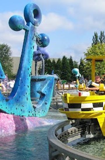 Engineered by Mack Rides, Splash Bash features a 25-meter lift hill, the tallest element, followed by a series of drops including a signature 15-meter near-vertical plunge. Boats hold 8-12 passengers, swaying through U-shaped turns that mimic river rapids before the climactic splashdown into a lagoon-style pool. The structure incorporates thematic elements like cartoonish wildlife and watery caverns, tying into the park's family-friendly vibe. Water recirculation systems ensure consistent flow, while safety gates and harnesses secure riders during the high-speed finale. The ride's footprint blends seamlessly with surrounding greenery, offering shaded queues under mature trees.Historical Evolution and Park Context