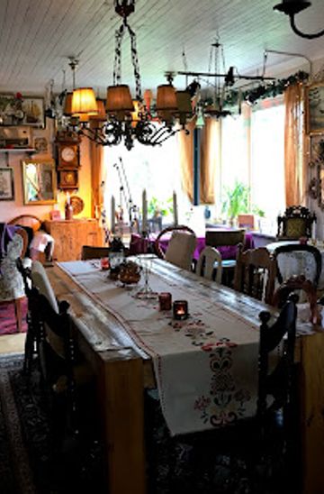 Café Gula Huset sits in a yellow-painted house that reads like a large family kitchen turned public room: wooden floors, mismatched chairs and framed local photos create an intimate, lived-in feel. The layout flows from a small indoor dining room into an adjoining conservatory and then out to a sheltered garden; the overall impression is informal and welcoming, with sunlight pooling across tabletops in summer and a warming stove glow in colder months.Food, drinks and culinary approach