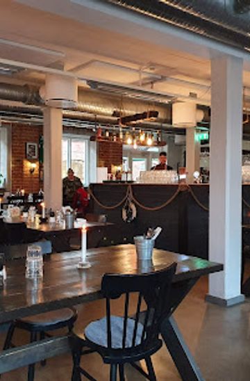 An industrial-chic matbar and gallery on Tändsticksgränd—burgers, seasonal plates and rotating art exhibitions in a lively, repurposed brick hall.