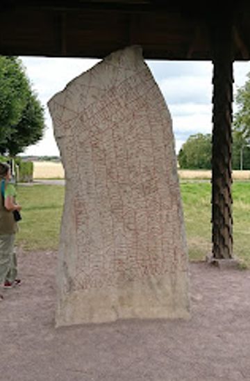 - Note the protective roof overhead, installed to shield the stone from Sweden's variable weather.