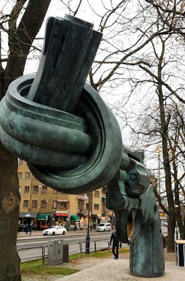 Gaze upon the knotted Colt Python on Gothenburg's Kungsportsavenyen—a bronze beacon of peace born from John Lennon's tragic loss, symbolizing non-violence worldwide.