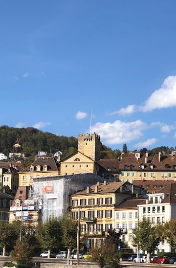 To reach Tour des Prisons using public transportation, start by finding the nearest bus or train station. If you are near the Neuchâtel main train station (Gare de Neuchâtel), take the bus line 3 or 5 towards 'Les Hauts de la Ville' and get off at 'Champ du Midi'. From there, it's a short 5-minute walk to Rue J.-de-Hochberg 3. Alternatively, you can walk from the train station, which takes about 15 minutes. Just head southeast on Avenue de la Gare, then turn left onto Rue de la Collégiale, and continue until you reach Rue J.-de-Hochberg.