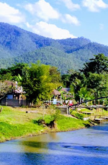 Rent a bicycle from one of the many rental shops in Pai. Start from the center of Pai and ride north along the main road (Rim Pai Road) for about 1 kilometer. Once you approach the bridge over the Pai River, take a right turn onto the road next to the river. Continue biking for another 400 meters and you will arrive at Café De Pai on your right side, with the location marker 9C5V+GCW.