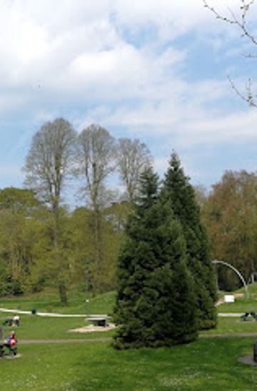 Adjacent to the main playground is an outdoor gym, inviting fitness enthusiasts to exercise in the fresh air. The park’s layout includes gently sloping wooded banks and wide open flat spaces, ideal for walking, jogging, or casual relaxation. Picnic benches and a café enhance the visitor experience, offering spots to rest and refresh. A water fountain and a historic cannon add unique touches to the park’s character.Natural Setting and Scenic Surroundings