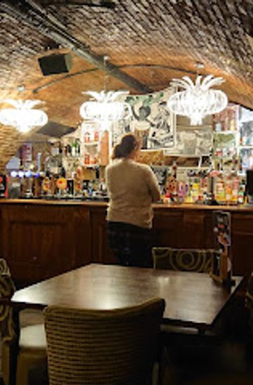 The narrow, windowless interior is lined with long tables and benches, fostering a communal and cozy environment. The exposed brickwork and vaulted ceilings add to the cellar’s quirky character, making it a distinctive spot for those seeking a traditional yet lively pub experience. Despite its historic roots, the venue maintains a vibrant atmosphere, popular with both locals and tourists.Food and Drink Offerings