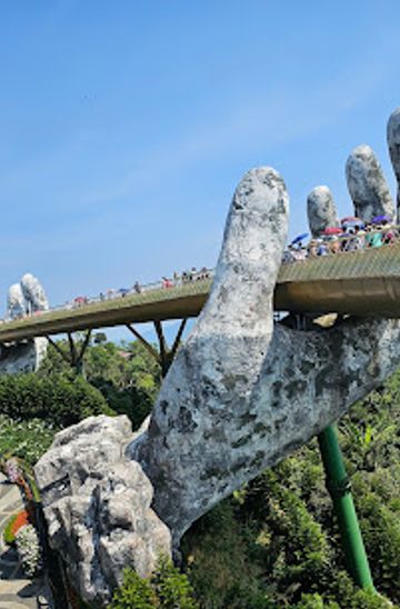 Nestled in the picturesque Ba Na Hills, the Golden Bridge is a stunning architectural wonder held aloft by giant stone hands, offering breathtaking views and unforgettable experiences for tourists exploring Vietnam.
