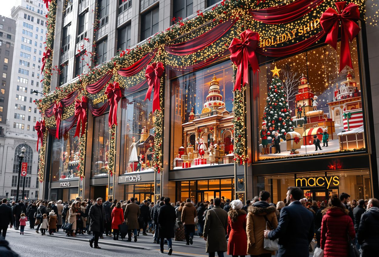A nighttime city scene showing Fifth Avenue department store façades with holiday window displays and a synchronized light show, bustling with stylish pedestrians and rich, realistic textures.