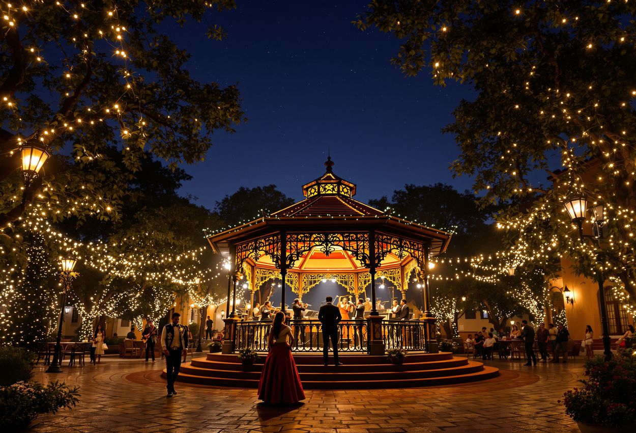 Image Description: A wide-angle shot capturing the vibrant Jardin Allende in San Miguel de Allende at night during Christmas. The purpose is to showcase the festive atmosphere and the community gathering in the main square. The gazebo is brightly lit, with a mariachi band performing traditional Christmas music. People of all ages are gathered around, some dancing, others singing along, and many simply enjoying the ambiance. The square is adorned with Christmas lights and silver star decorations, creating a magical glow. Style instructions: The photo should be taken with a wide-angle lens to capture the entire square and the surrounding buildings. The lighting should be warm and inviting, highlighting the festive decorations and the faces of the people. The focus should be sharp on the gazebo and the mariachi band, with a slight blur on the background to create depth. The image should be taken on December 20, 2025, around 8:00 PM, capturing the lively atmosphere of the evening celebrations.
