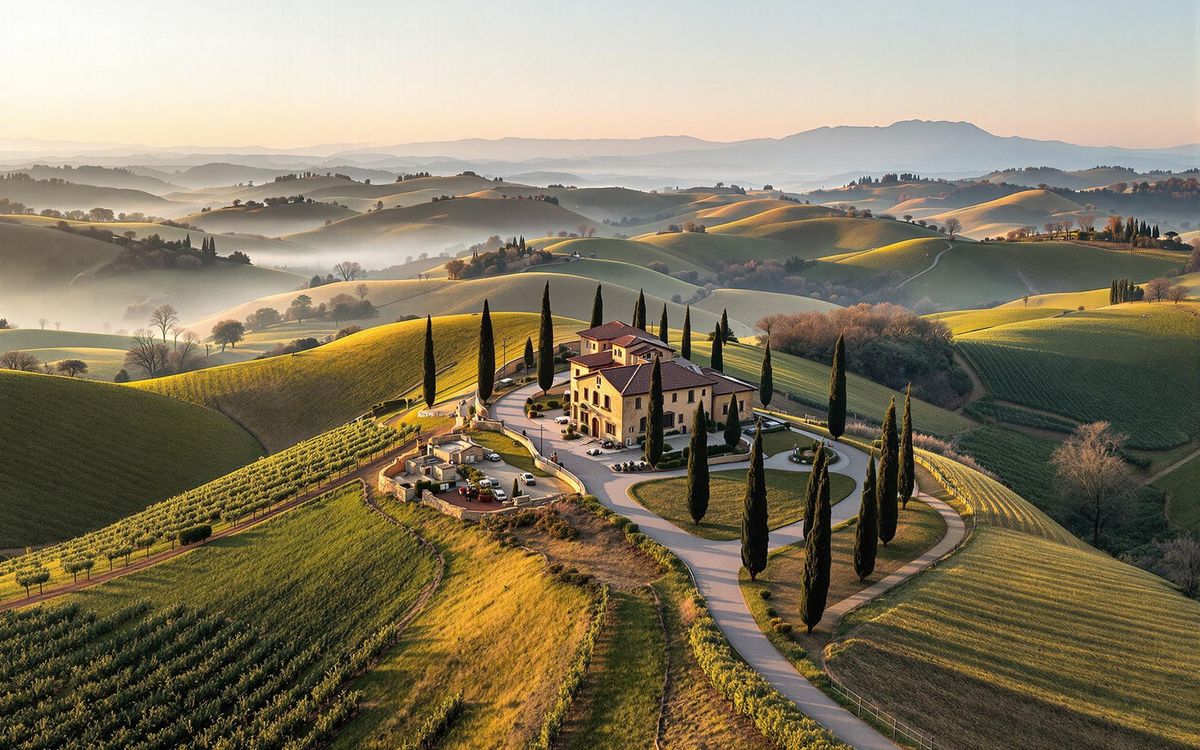 Image Description: An aerial shot of the rolling hills of Val d'Orcia, Italy, in the early morning. A winding road lined with cypress trees leads to a farmhouse in the distance. The landscape is bathed in soft, golden light. The time of year is Feuary. The picture is taken on Feuary 4th, 2025.