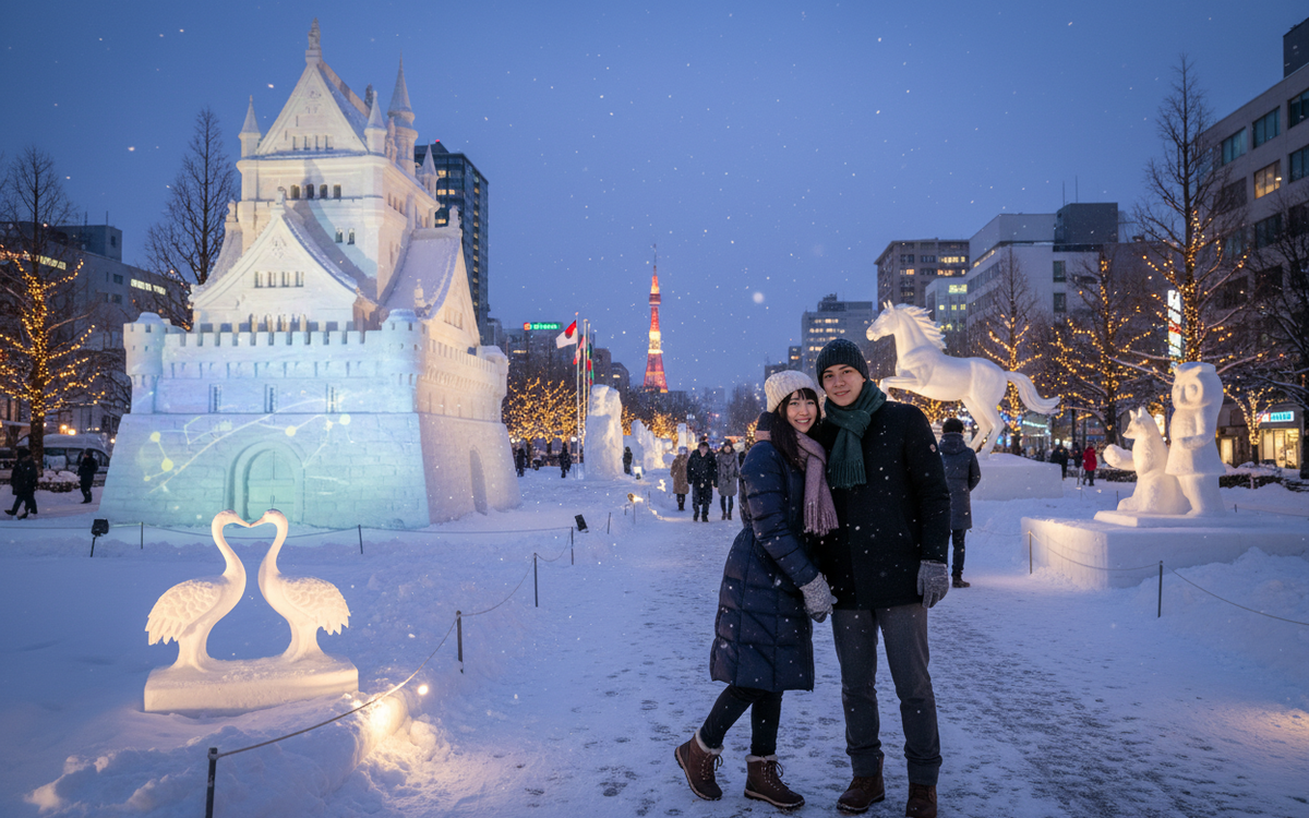 Amid the spectacle, your eyes are drawn to smaller, more intimate details: the curve of a snow-sculpted hand resting on a balustrade; the lacework of snow carved into a kimono sleeve; the suggestion of wind in the folds of a cloak. One sculpture presents an elegantly carved couple standing side by side, modeled after traditional wedding figures from northern Japan. Their faces are serene, turned slightly toward each other, noses almost touching. You stand there with your partner, inches from these frozen lovers, noticing how the sculptor has carved a single delicate snowflake on the hairpin of the bride a detail many visitors breeze past without seeing. Under the lights, that modest motif glows softly, like a secret blessing for anyone who notices.