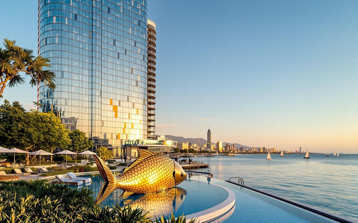 The hotel's surroundings are equally captivating. Renowned architect Frank Gehry's gleaming copper Fish sculpture sits near the hotel's infinity pool, its golden scales shimmering in the sun. The sculpture appears to leap towards the Mediterranean, creating a dynamic interplay between art and nature. The hotel's garden, spanning over 10,700 square feet, provides a lush landscape that complements the sculpture, grounding the hotel in its environment. The garden's design is based on the copper fish. The meticulous attention to detail extends from the architecture to the landscaping, creating a harmonious and visually stunning experience.