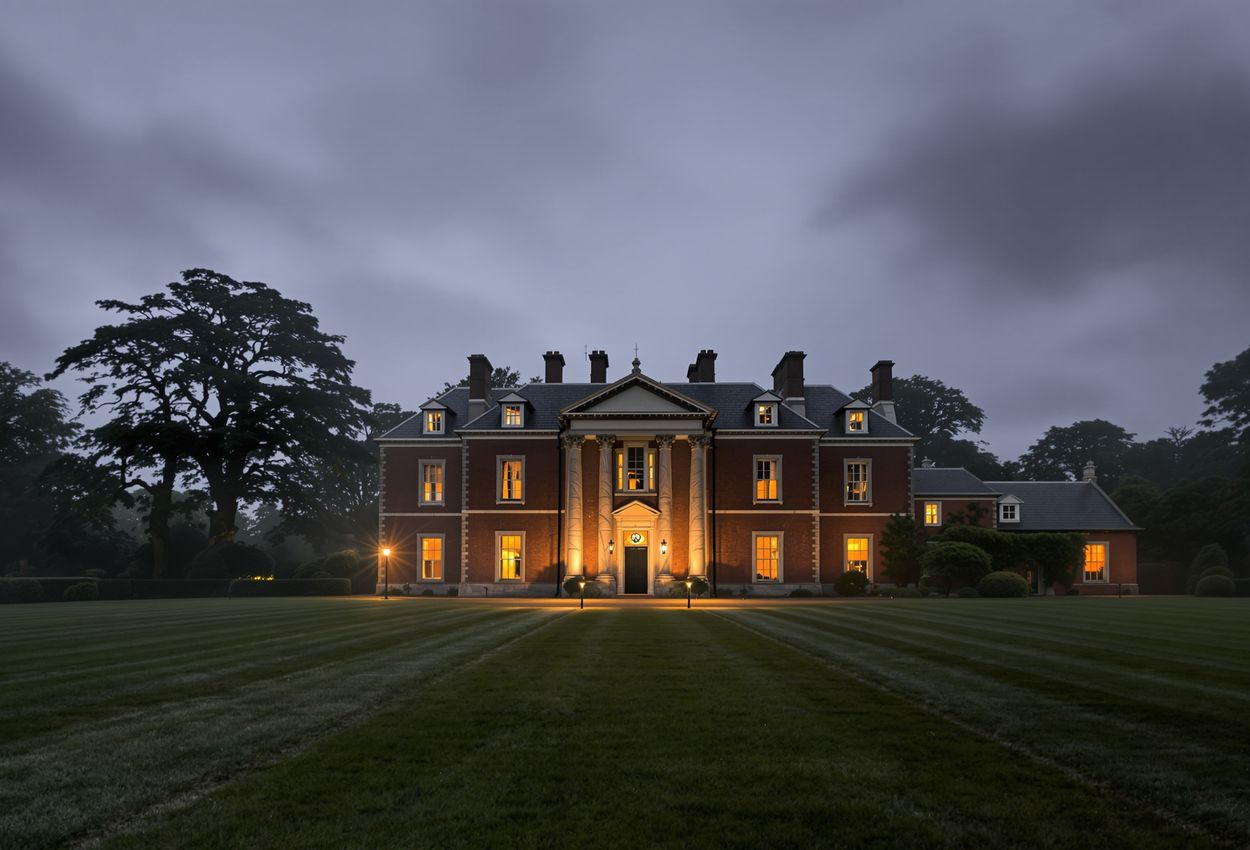 Image Description: An exterior shot of Raynham Hall in Norfolk, England, captured at dusk. The lighting is dim and eerie, with long shadows stretching across the grounds. The architectural details of the hall are emphasized, creating a sense of history and mystery. Style Instructions: The photo should be taken with a wide-angle lens to capture the entirety of the hall, with a shallow depth of field to focus on the building's facade. The lighting should be natural and atmospheric, with a subtle glow emanating from the windows. The date of the photo is October 31, 2025, emphasizing the perfect time to capture the haunted essence of this famous location during Halloween.